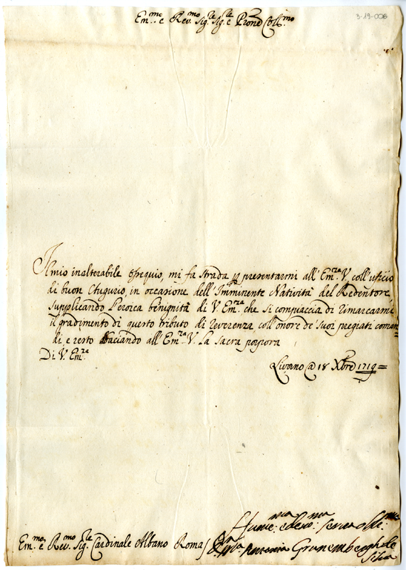 Lettera di Maria Antonia Grunembergh de Silva al cardinale Annibale Albani (1719 dicembre 18)