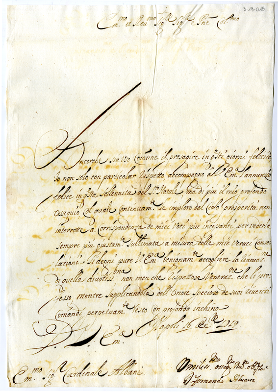 Lettera di Ferdinando Alvarez al cardinale Annibale Albani (1719 dicembre 16)