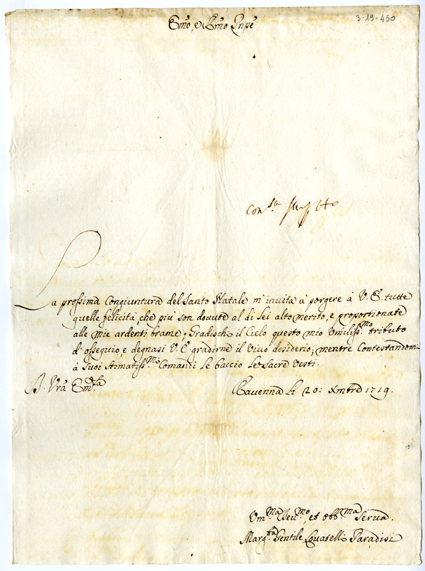 Lettera di Margherita Gentile Zoccatelli Paradisi ad Annibale Albani (1719 dicembre 20)