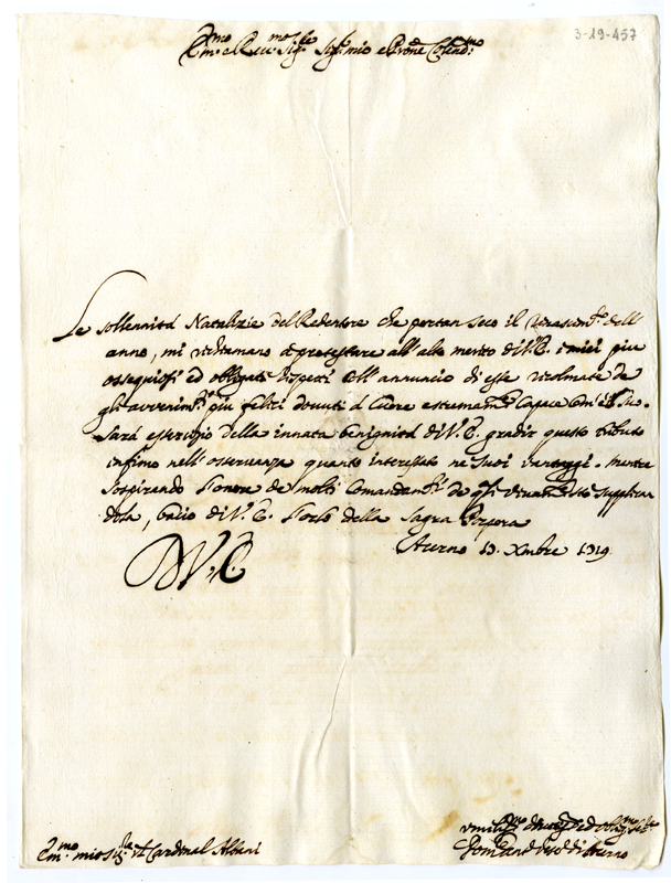 Lettera di Domenico Antonio vescovo di Acerno al cardinale Annibale Albani (1719 dicembre 17)