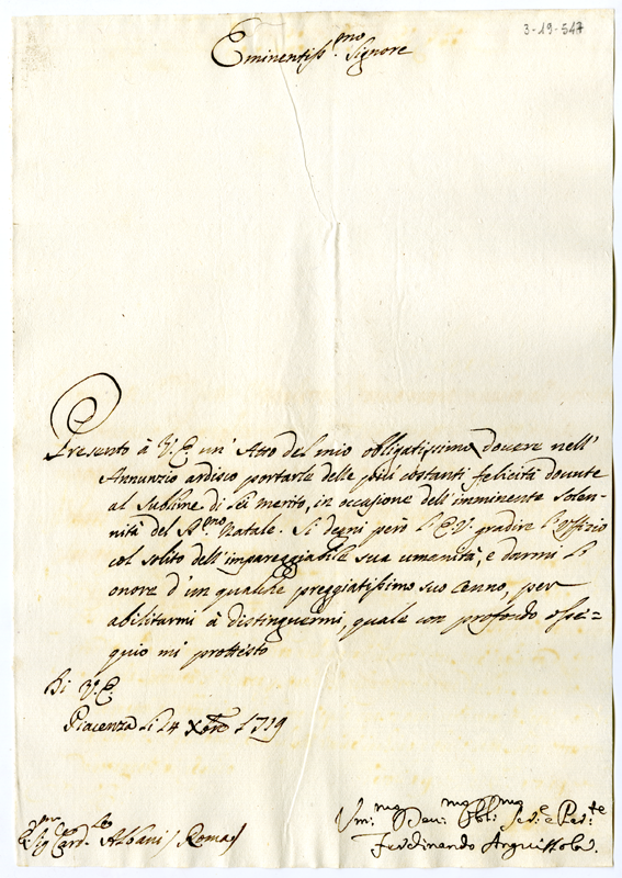 Lettera di Ferdinando Anguissola al cardinale Annibale Albani (1719 dicembre 14)