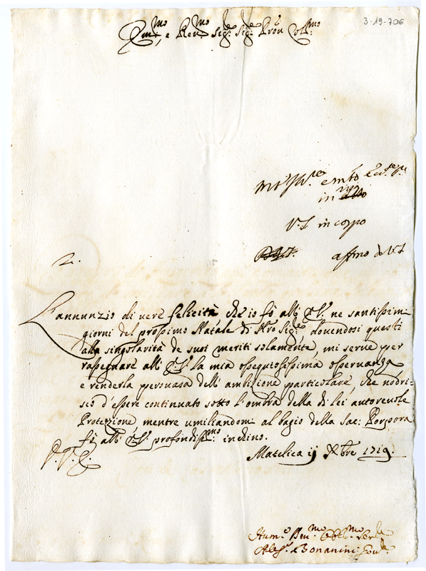 Lettera di Alessandro Bonanini ad Annibale Albani (1719 dicembre 11)