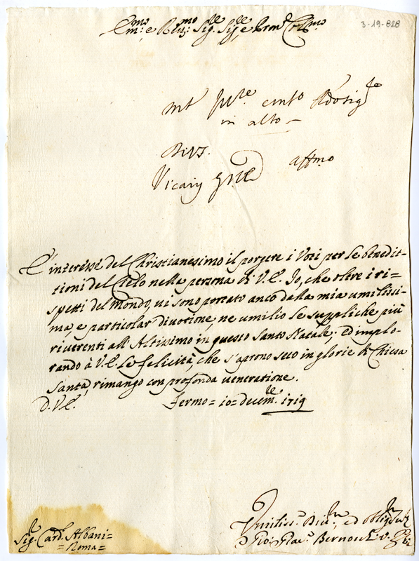 Lettera di Giovanni Giacomo Bernocchi al cardinale Annibale Albani (1719 dicembre 10)