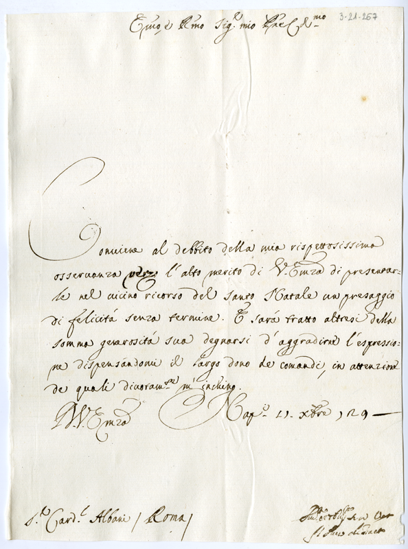 Lettera del duca di Traetto al cardinale Annibale Albani (1729 dicembre 17)