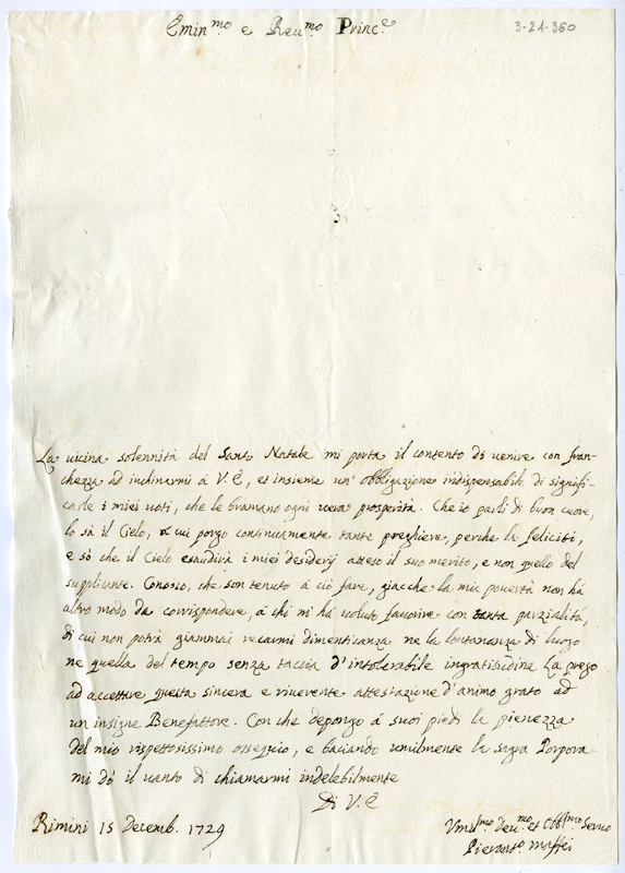 Lettera di Pierantonio Maffei al cardinale Annibale Albani (1729 dicembre 15)
