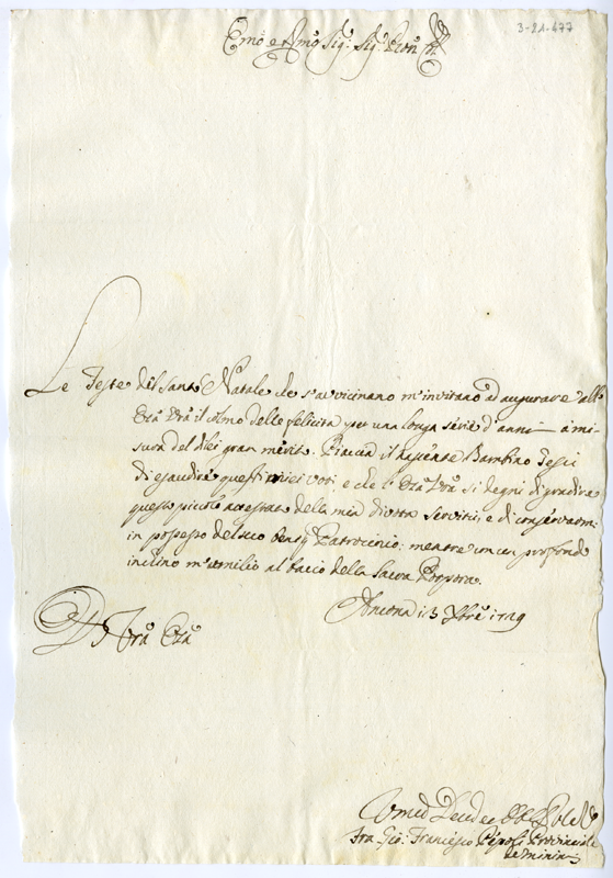 Lettera di Giovanni Francesco Pepoli provinciale dei minimi al cardinale Annibale Albani (1729 dicembre 13)