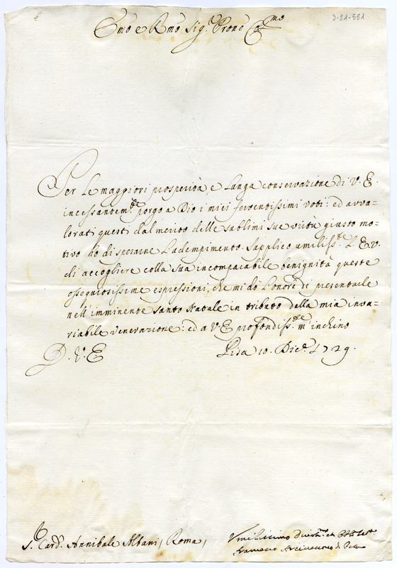 Lettera di Francesco arcivescovo di Pisa al cardinale Annibale Albani (1729 dicembre 10)