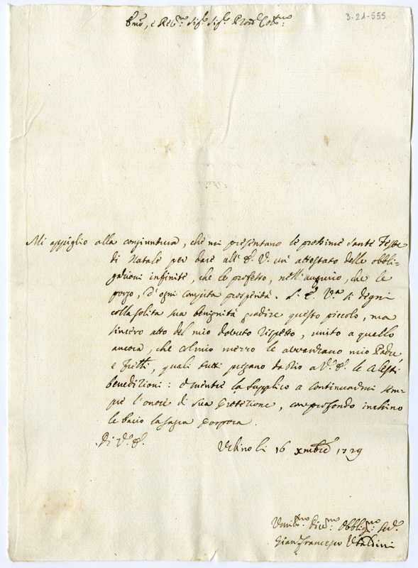 Lettera di Gianfrancesco Ubaldini al cardinale Annibale Albani (1729 dicembre 16)