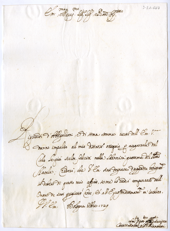 Lettera di Cesare Gambalunga Bianchetti al cardinale Annibale Albani (1729 dicembre)