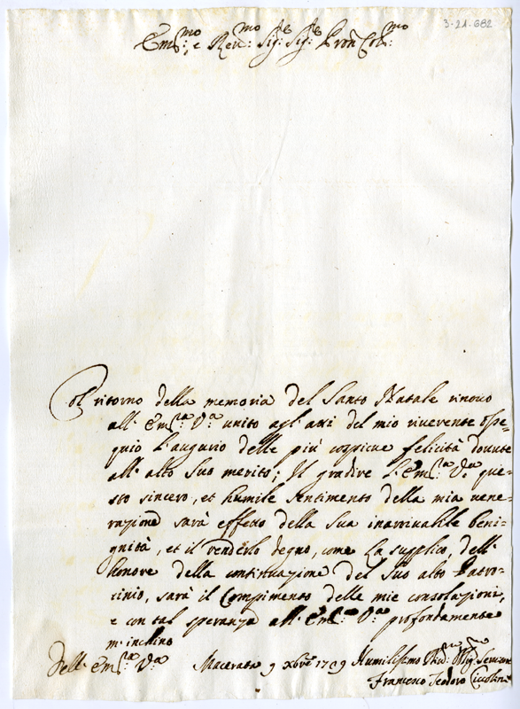 Lettera di Francesco Teodoro Ciccolini al cardinale Annibale Albani (1729 dicembre 9)