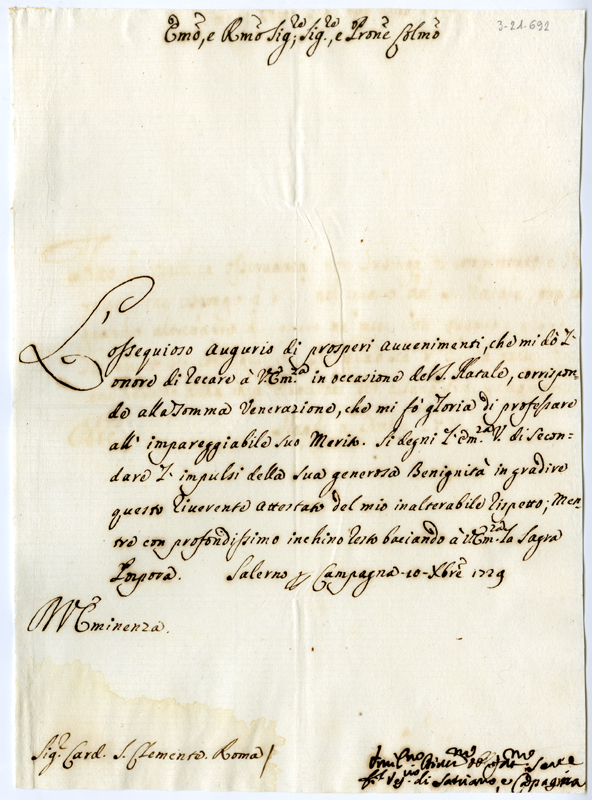 Lettera di Francesco Saverio vescovo di Satriano e Campagna al cardinale Annibale Albani (1729 dicembre 10)