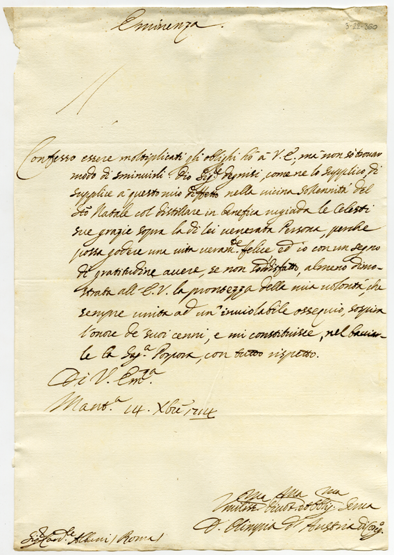 Lettera di Olimpia d'Austria al cardinale Annibale Albani (1714 dicembre 14)