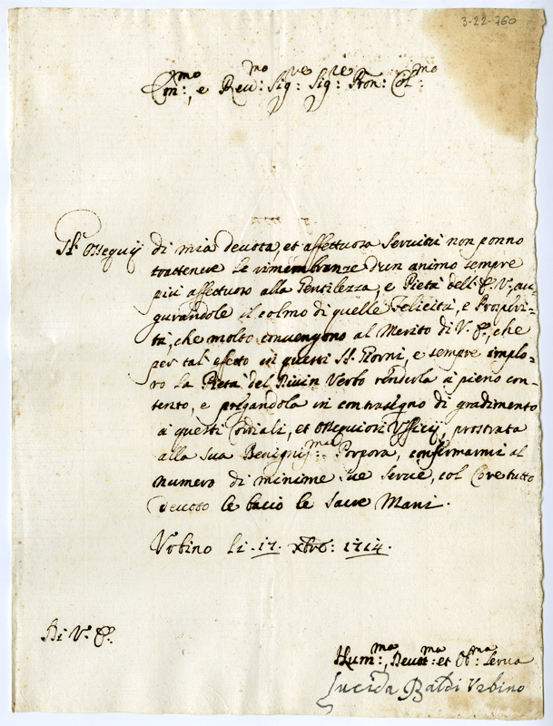 Lettera di Lucida Baldi al cardinale Annibale Albani (1714 dicembre 17)