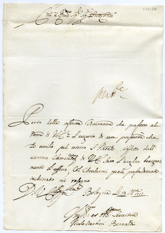 Lettera di Nicolò Barbieri Beroaldi al cardinale Annibale Albani (1717 dicembre 13)