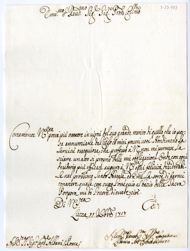 Lettera di Ludovico Antonio Boccadiferro al cardinale Annibale Albani (1717 dicembre 11)