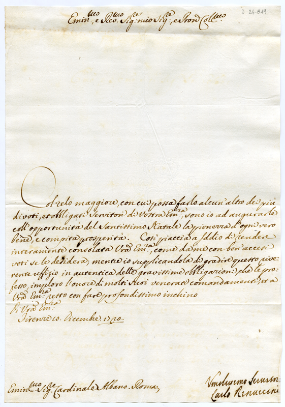 Lettera di Carlo Rinuccini al cardinale Annibale Albani (1720 dicembre 10)
