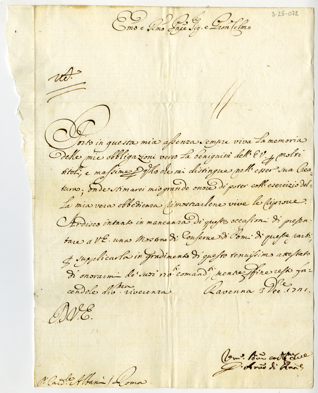 Lettera di Girolamo arcivescovo di Ravenna al cardinale Annibale Albani (1721 dicembre 3)