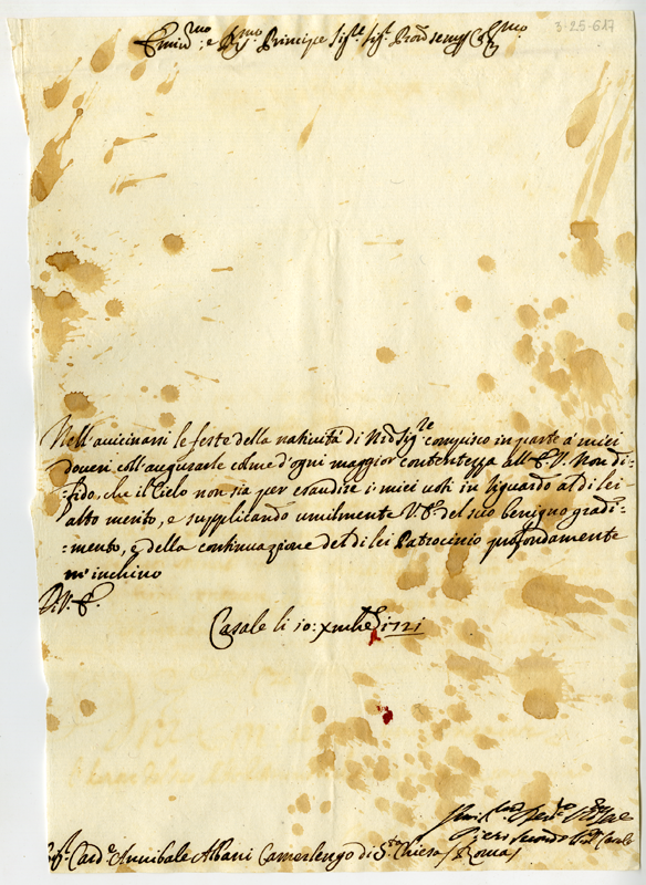 Lettera di Pier Secondo vescovo di Casale al cardinale Annibale Albani (1721 dicembre 10)