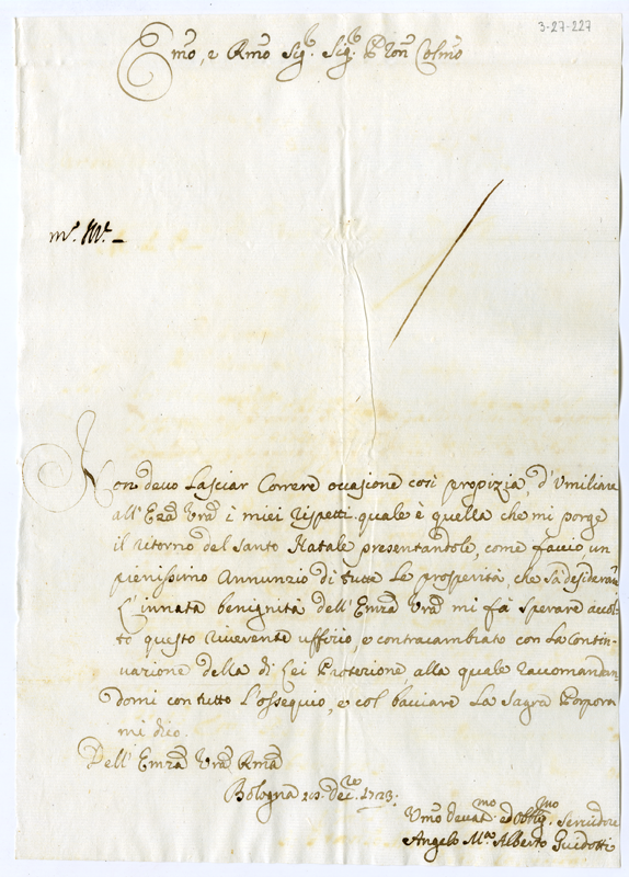 Lettera di Angelo Maria Alberto Guidotti al cardinale Annibale Albani (1723 dicembre 18)