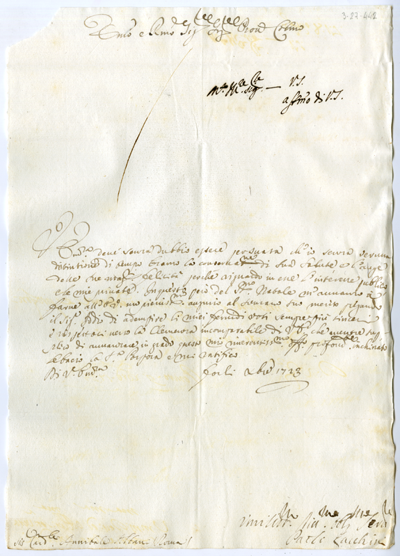 Lettera di Paolo Lacchini al cardinale Annibale Albani (1723 dicembre)