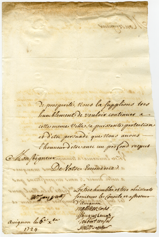 Lettera dei consoli e assessori di Avignone al cardinale Annibale Albani (1724 dicembre 6)