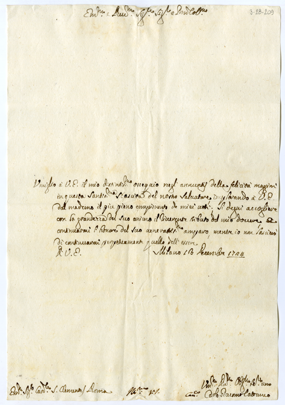 Lettera di Carlo Giacomo Cattaneo al cardinale Annibale Albani (1724 dicembre 13)
