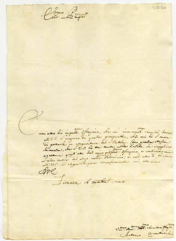 Lettera di Antonio Quartieri al cardinale Annibale Albani (1724 dicembre 16)
