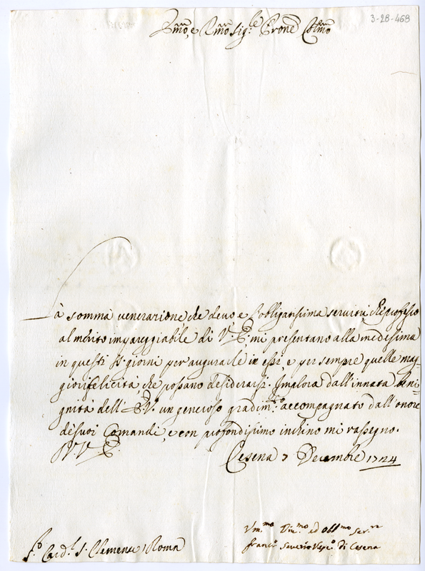 Lettera di Francesco Saverio vescovo di Cesena al cardinale Annibale Albani (1724 dicembre 7)