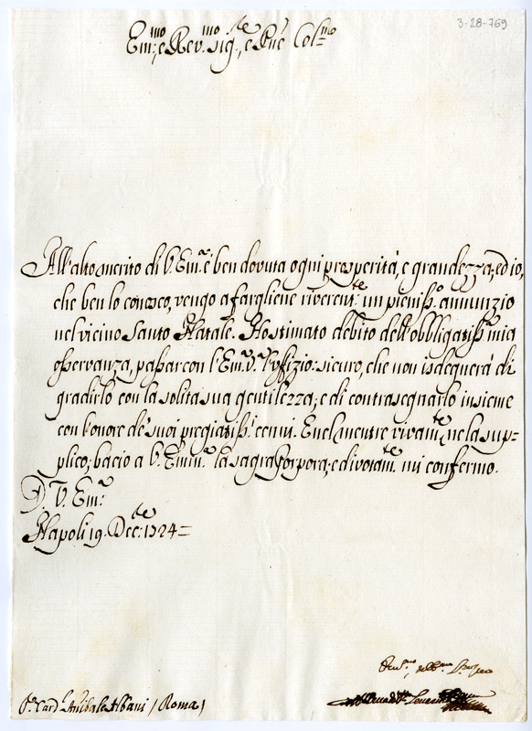 Lettera del duca di Santa Severina al cardinale Annibale Albani (1724 dicembre 19)