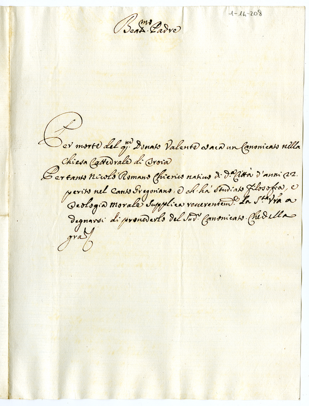 Il chierico Nicolò Romano chiede al pontefice un canonicato