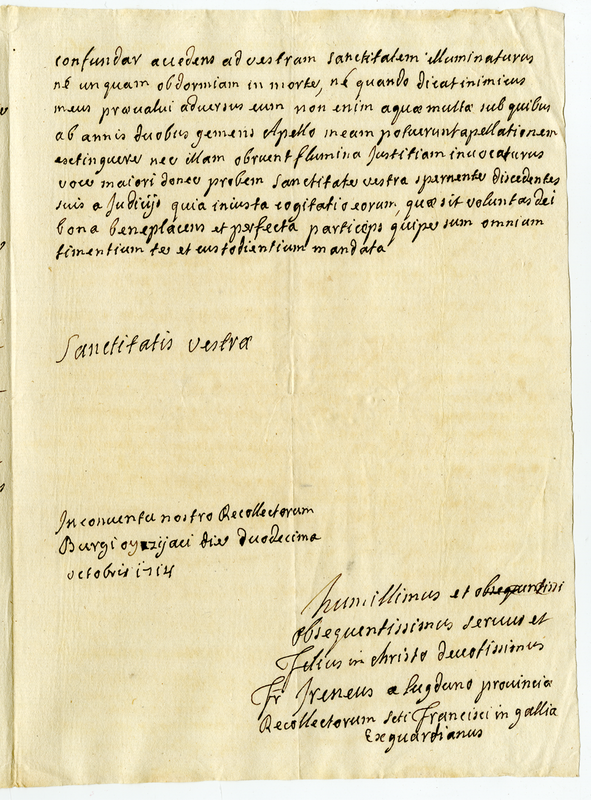 Lettera di fra Ireneo da Lione a Clemente XI (1714 ottobre 12)