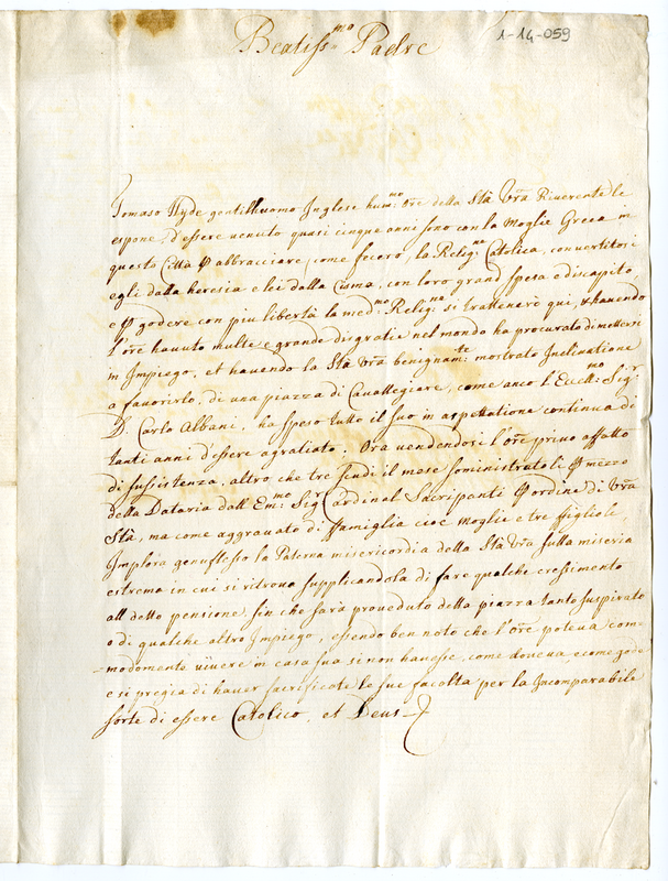 Thomas Hyde, gentiluomo inglese, convertitosi al cattolicesimo inseme a sua moglie, chiede al pontefice sostentamente per sè e per la propria famiglia