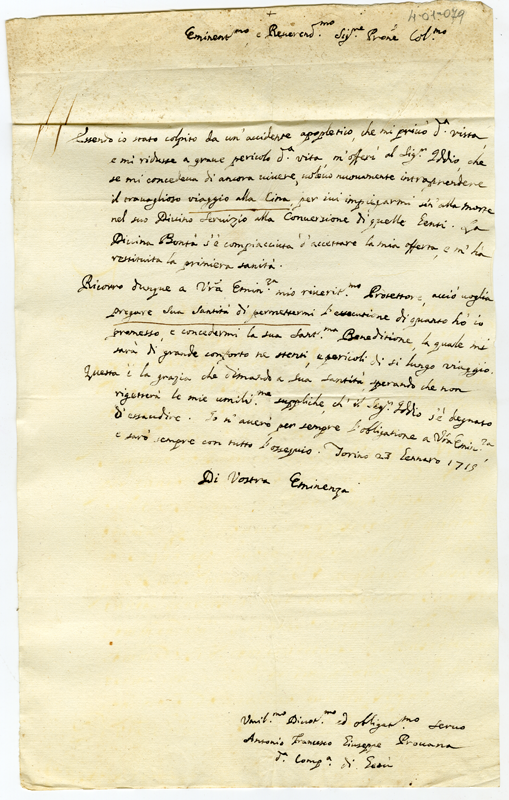 Chiede al cardinale l'intercessione presso il pontefice perché possa recarsi in missione in Cina a compimento di un voto fatto