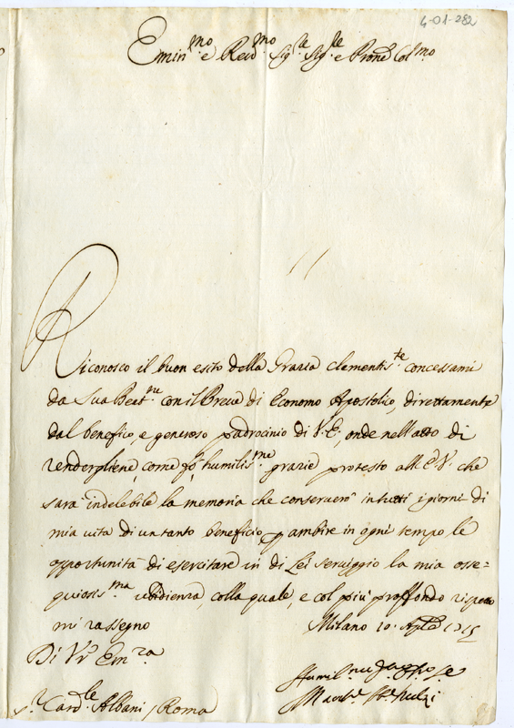 Lettera del Marchese Abbate Melzi al Cardinale Annibale Albani (1715 aprile 10)