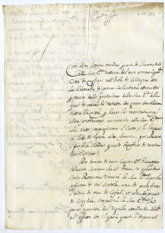 Comunica di aver inviato altra lettera per la via di Livorno con la notizia del suo felice arrivo a Cagliari e comunica che suo cugino don Giuseppe Salvatore Sanna farà avere al cardinale una scatole di paste, una di uova di celalo e altra con prosciutti di cinghiale