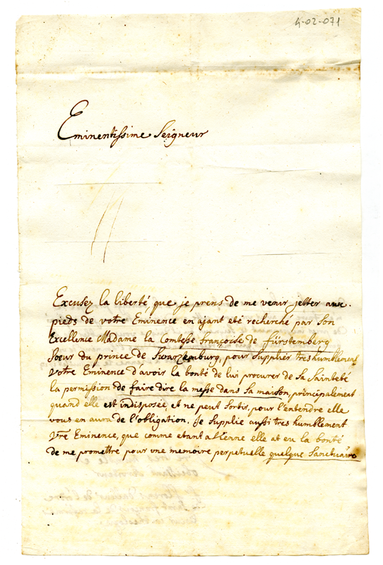 Supplica il cardinale di concedere alla contessa di Fuerstemberg la facoltà di udire messa in casa propria, specialmente nei tempi di indisposizione