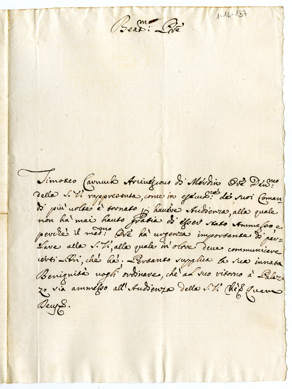 Timoteo Carnuch chiede di essere ricevuto dal pontefice anche per poter consegnare alcuni libri in suo possesso
