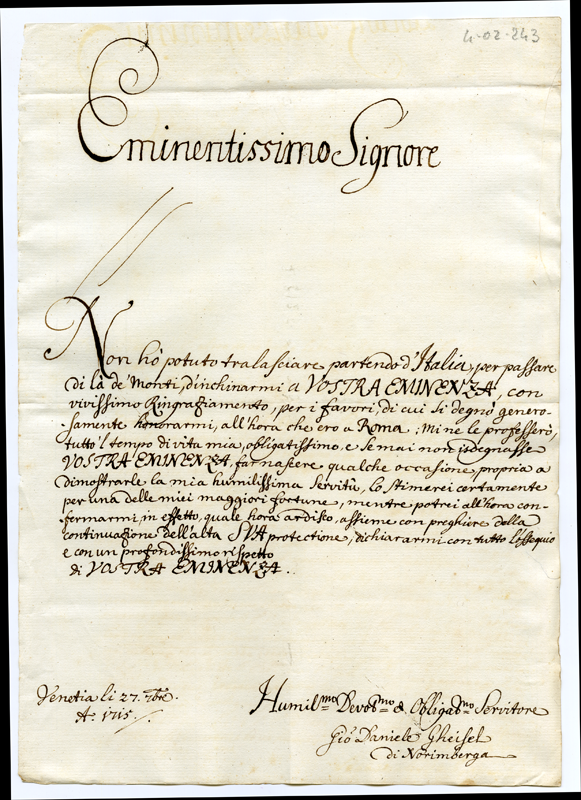 Lettera di Giovanni Daniele Gheifel di Norimberga al Cardinale Annibale Albani (1715 settembre 27)