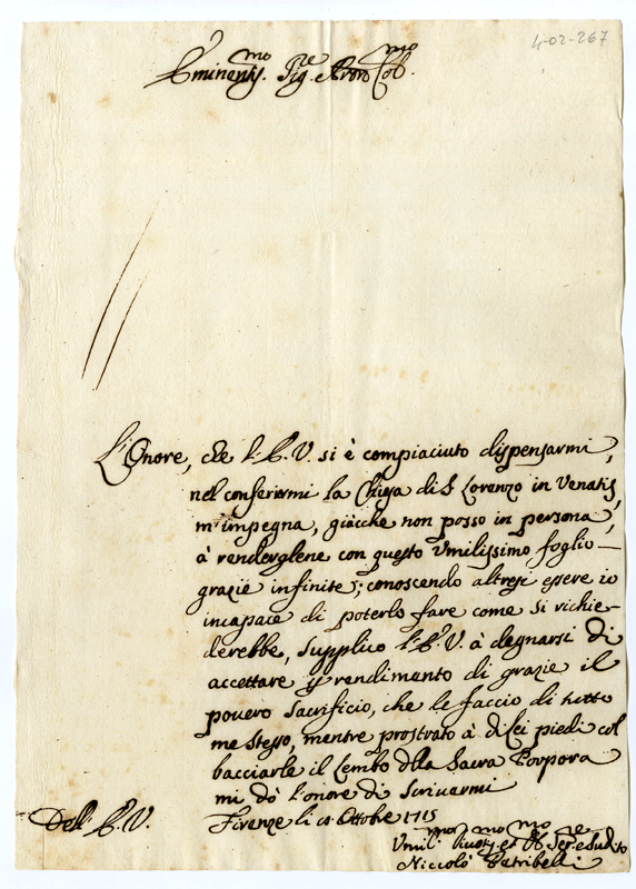 Lettera di Nicolò Petribelli al cardinale Annibale Albani (1715 ottobre 8)