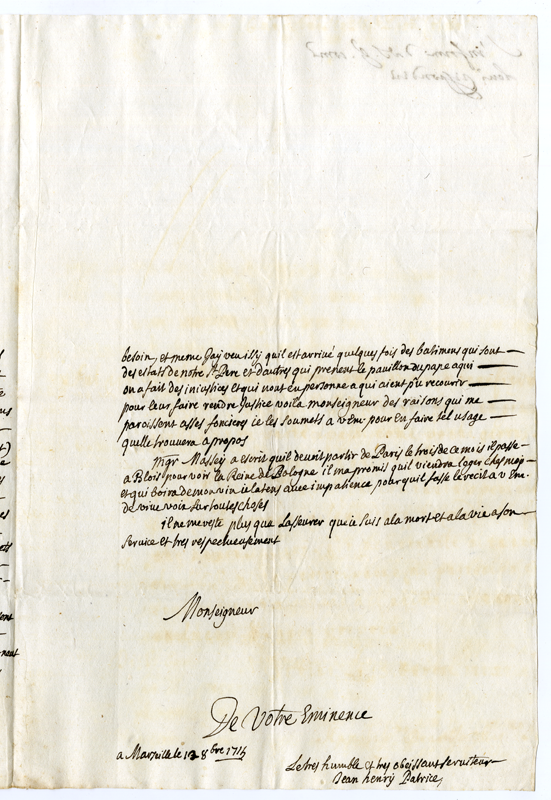 Lettera di Jean Henry Patrice al cardinale Annibale Albani (1715 ottobre 17)