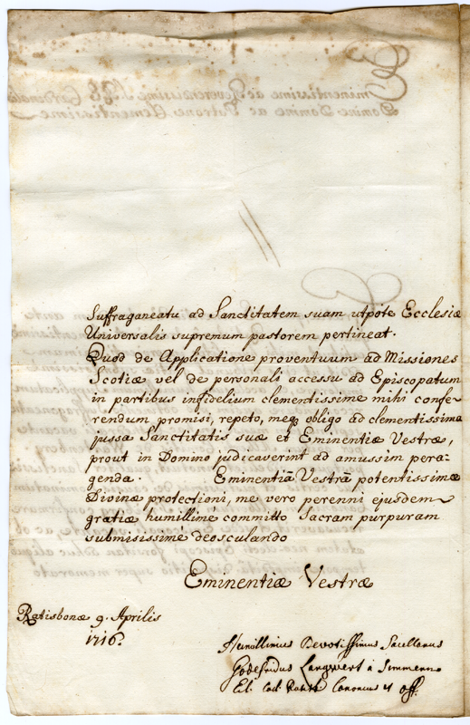 Lettera di Goffredo Langvert al Cardinale Annibale Albani (1716 aprile 9)