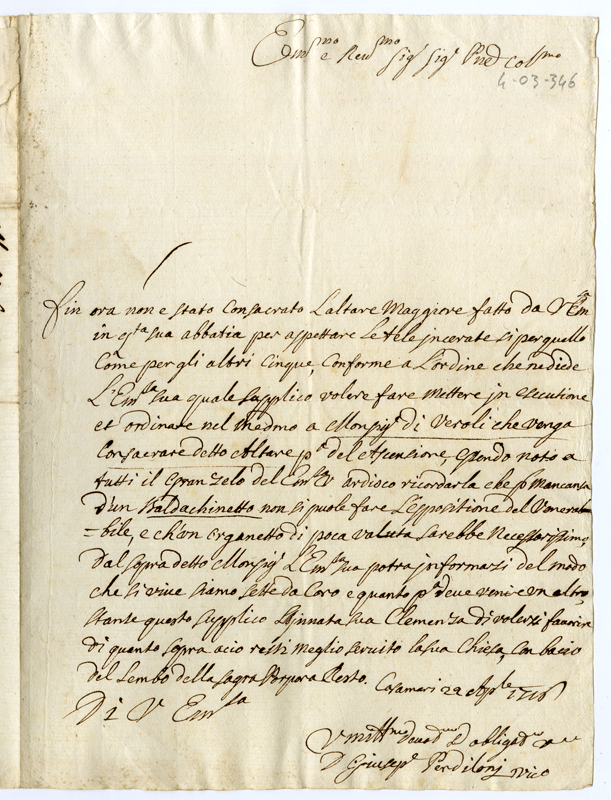 Lettera di Giuseppe Perdiloni monaco cistercense al Cardinale Annibale Albani (1716 aprile 22)