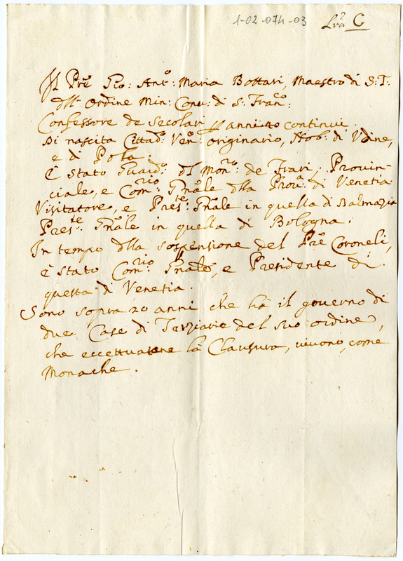 Requisiti del padre Giovanni Antonio Bottari maestro dell'ordine dei minori conventuali di S. Francesco, aspirante alla vacante chiesa di Caorle.