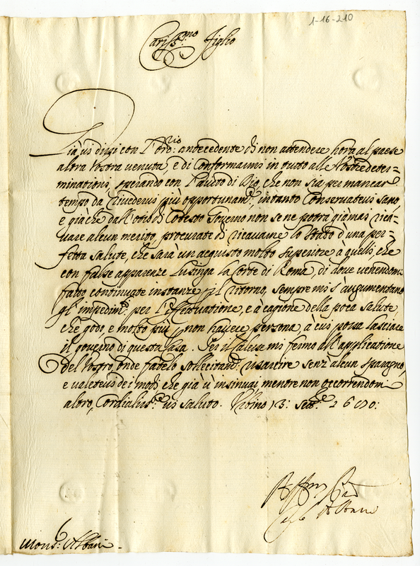 Lettera di Carlo Albani a Giovanni Francesco Albani (1680 settembre 13)