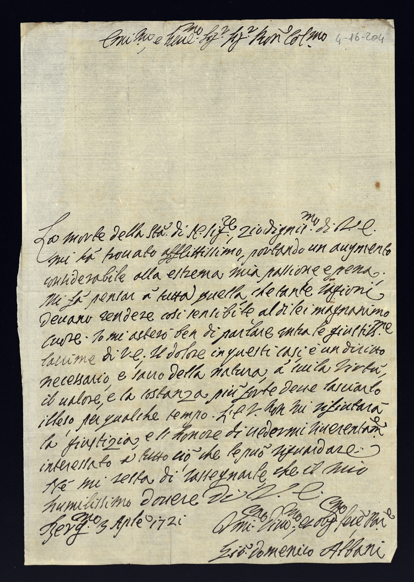 Lettere di condoglianza per la morte di Papa Clemente XI di gloriosa memoria
