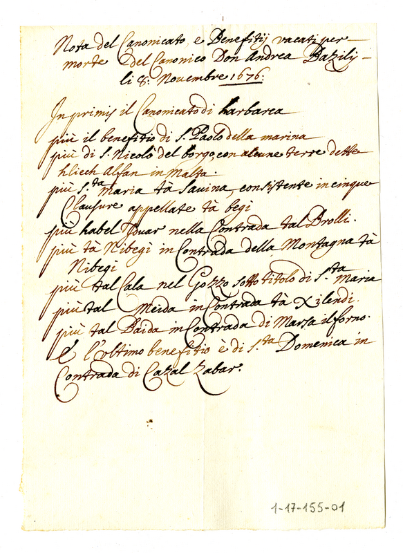 Nota del canonicato e benifizii vacati per morte del canonico don Andrea Bazilii li 8 novembre 1676