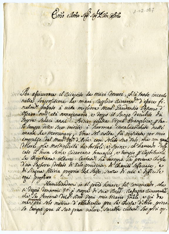Suggerimenti dell'arcivescovo di Zara per la nomina del dott. Zeni alla chiesa di Ossero.