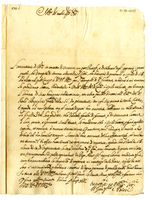 Lettera del gonfaloniere e dei priori di Urbino a papa Clemente IX (1667 luglio 9)