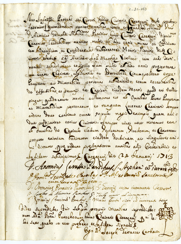 Fede de Parochi a favore del Reverendissimo Signor Don Antonio Grimaldi (1713 gennaio 24)