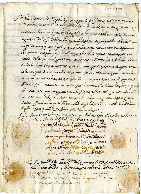 Attestato dei Regolari della città di Molfetta a favore dell'abate Giuseppe Rigante (1709 novembre 23)